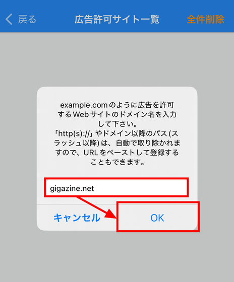 広告を許可したいサイトのドメインを入力して「OK」をタップします。