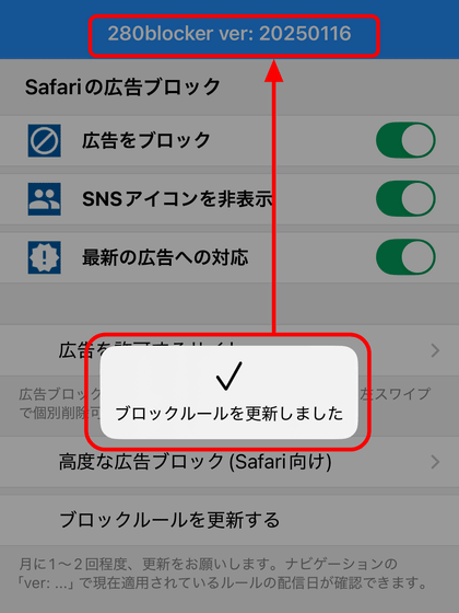 「ブロックルールを更新しました」と表示され、アプリの上部に表示されるバージョンが最新のものに更新されます。280blockerは最新の広告配信の傾向に合わせてかなりの頻度でブロックルールを調整しているため、一度購入したら長く使い続けることができます。