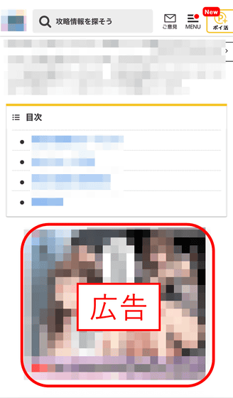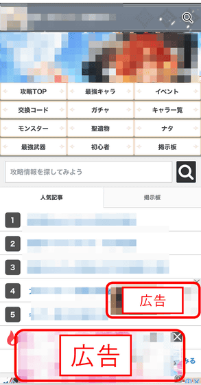 280blockerをオンにしないでゲーム攻略系サイトにアクセスしてみると、まず大きくポップアップ広告が表示されました。