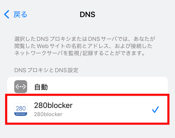 「280blocker」をタップして青いチェックマークが付いたら設定完了。