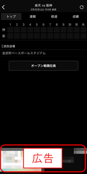 また、個別の試合スコアのページでもページ下部に広告が表示されており、頻繁にスコアを確認していると余分に通信量がかかったり誤タップしてしまったりすることがあります。