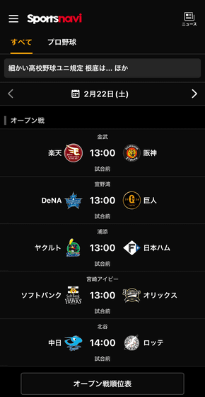 実際にSafari以外のアプリでも広告をブロックできるのか確認するために、まずは280blockerをオンにする前の状態でスポーツ速報のアプリを開いてみました。すると、試合情報一覧の上部に広告が表示されています。
