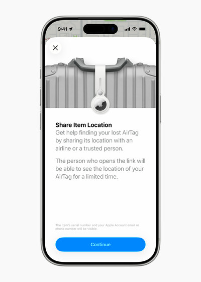 そして、AirTagの位置はこれまで「探す」で特定できましたが、加えてユーザーが紛失したアイテムの回収を支援するiOS機能「持ち物の位置情報を共有」と連携可能になります。これにより、ユーザーは紛失した荷物の位置情報を提携している航空会社のカスタマーサービスチームと共有できます。アクセスは、安全なApple Accountまたはパートナーの認証を通して、承認を受けた担当者にのみ許可されます。共有される位置情報は、ユーザーの手元に持ち物が戻るとすぐに無効になり、所有者はいつでも停止でき、7日後に自動的に期限切れになるとのこと。