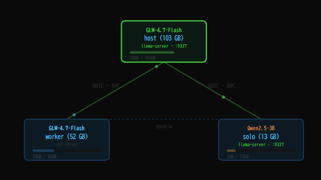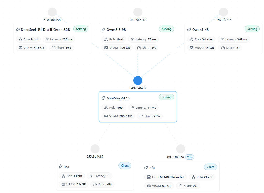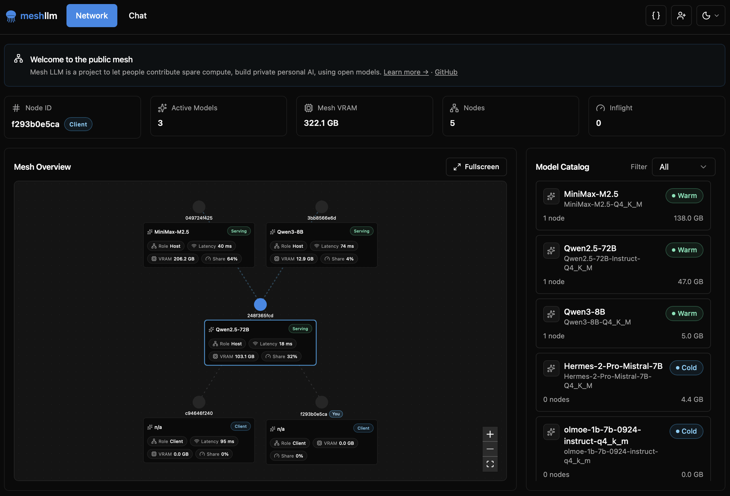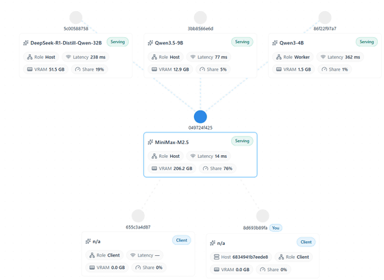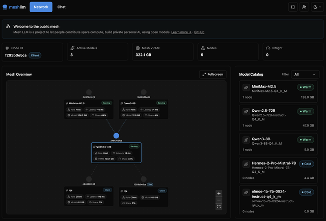 Mesh LLMは1つのモデルを分散実行するだけでなく、複数のモデルを同時に扱える点も特徴です。どのモデルをどのノードで動かすかを自動で振り分け、需要が高いモデルには待機ノードを回す仕組みも備えています。公開メッシュを自動発見して参加する機能もあり、GPUを持たない環境でもクライアント専用ノードとして利用できます。