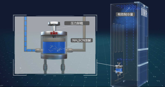 研究チームが用いたのは「チオシアン酸アンモニウム」(NH₄SCN)の水溶液に圧力をかけたものです。チオシアン酸アンモニウム溶液は加圧すると塩が析出して放熱し、減圧後、塩が迅速に溶解して急速に吸熱します。