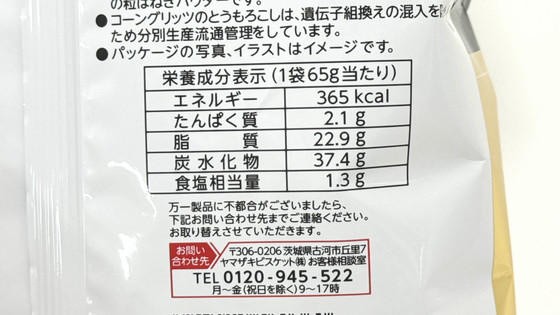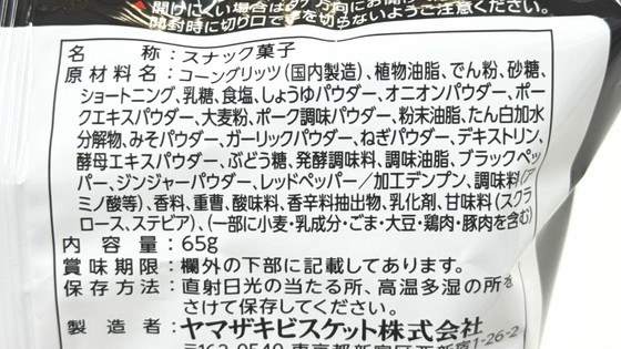 原材料はコーングリッツ、植物油脂、でん粉、砂糖、ショートニング、乳糖、食塩、しょうゆパウダー、オニオンパウダー、ポークエキスパウダー、大麦粉、ポーク調味パウダー、粉末油脂、たん白加水分解物、みそパウダー、ガーリックパウダー、ねぎパウダー、デキストリン、酵母エキスパウダー、ぶどう糖、発酵調味料、調味油脂、ブラックペッパー、ジンジャーパウダー、レッドペッパーなど。内容量は65gです。