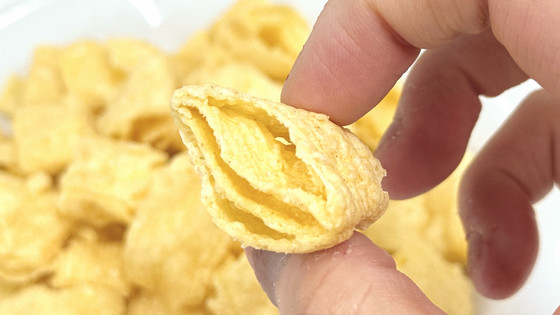 袋の中を開けてみました。エアリアルは4層構造のスナック菓子で、大きな空気の層がある軽い食感が特徴です。