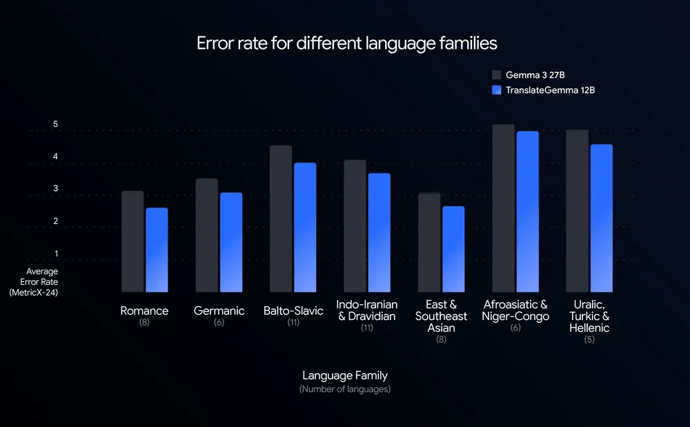 WMT24++というデータセットでテストしたところ、TranslateGemmaのエラー率はGemmaを大幅に下回りました。Googleは「開発者にとってこれは大きな勝利です。ベースモデルの半数以下のパラメータで高精度の翻訳品質を実現できます。この効率性の飛躍により、精度を犠牲にすることなく、より高いスループットと低いレイテンシが可能になります」とアピールしています。