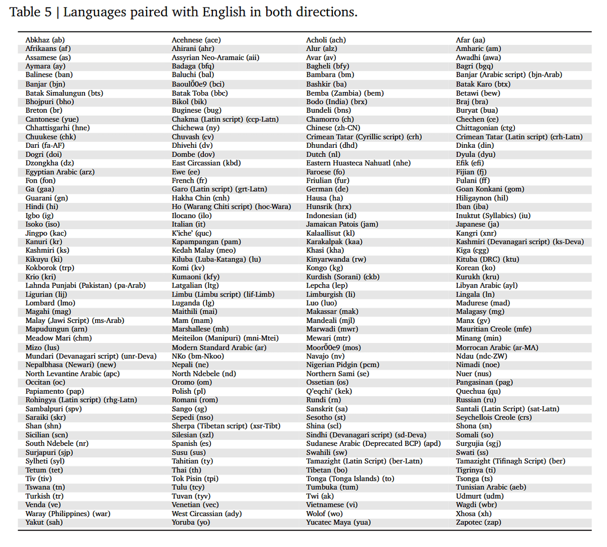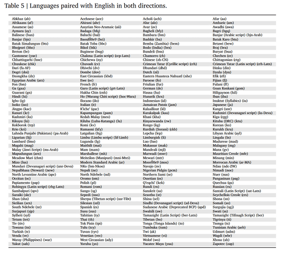 英語との双方向翻訳で使用された言語は以下の通り。