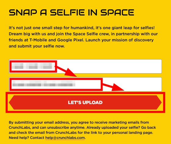 自撮りをアップロードするにはSpace Selfieの公式サイトにアクセスし、ページ中段に名前とメールアドレスを入力して「LET'S UPLOAD」をクリック。なお、自撮りをアップロードするとCrunchLabsからのマーケティングメールの受信に同意したことになるので注意。ただし、メールの配信停止はいつでも可能です。