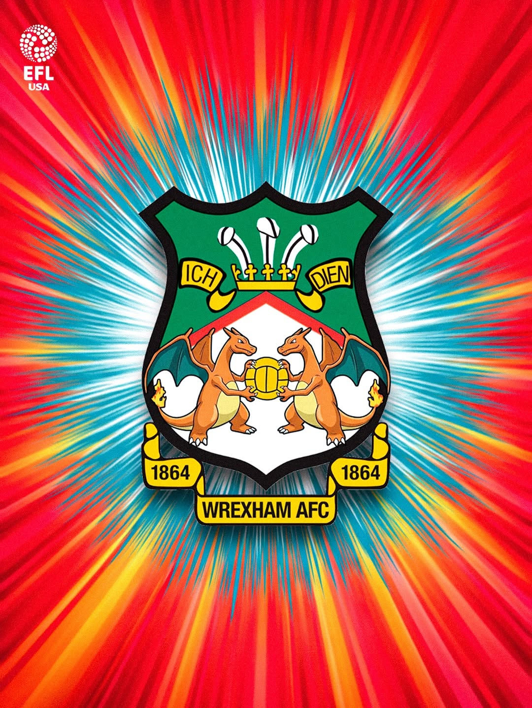 1864年創設のウェールズ最古のプロサッカークラブである「レクサムAFC」は、ハリウッド俳優のライアン・レイノルズとロブ・マケルヘニーが買収したことでも知られています。元のエンブレムで赤色のドラゴンがあしらわれている部分が、「リザードン」に変身しています。