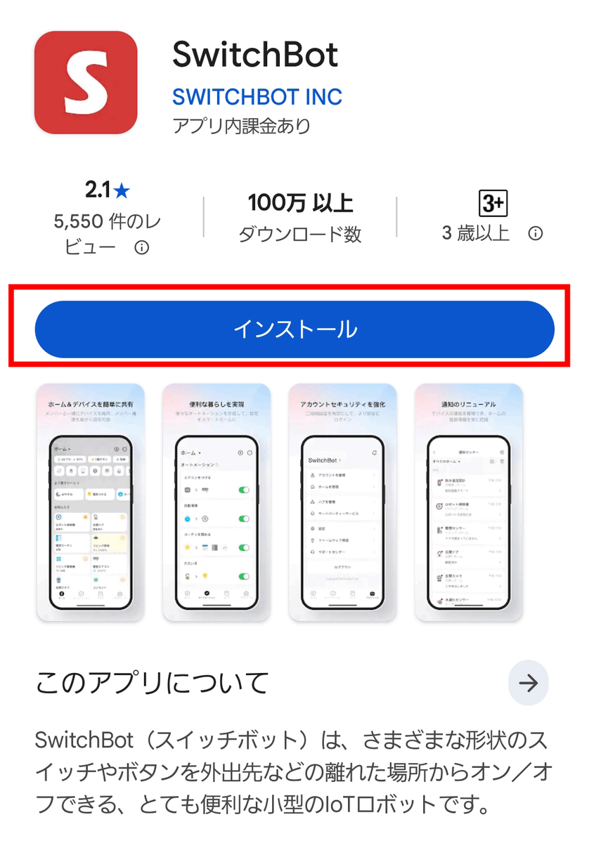 今回はAndroid版をインストールしていきます。Google PlayでSwitchBotアプリの配布ページにアクセスしたら、「インストール」をタップ。