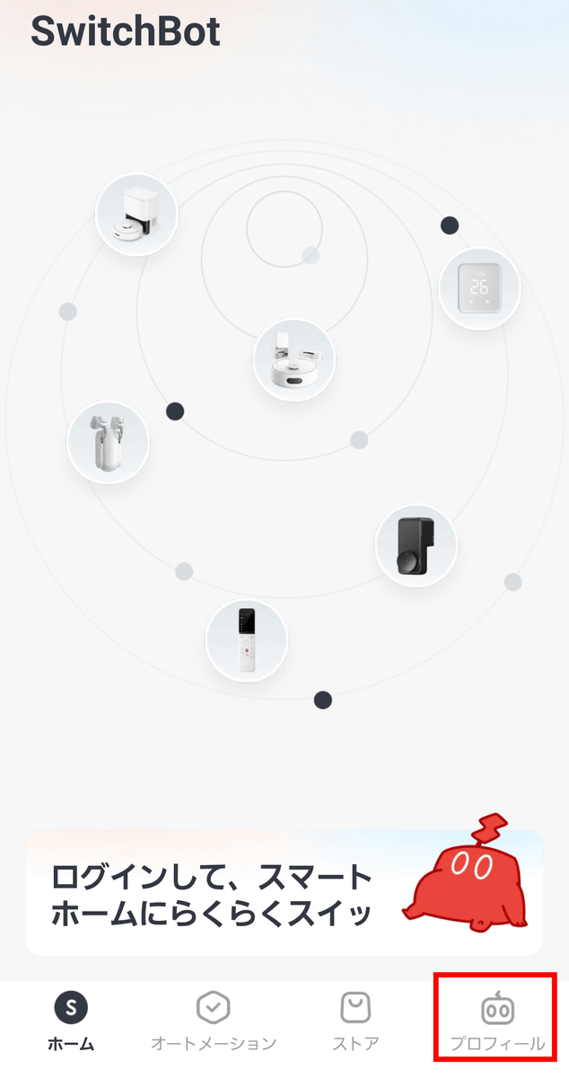 アプリのトップ画面は以下のような感じ。デバイスと接続する前にアカウント登録が必要なため、「プロフィール」をタップ。
