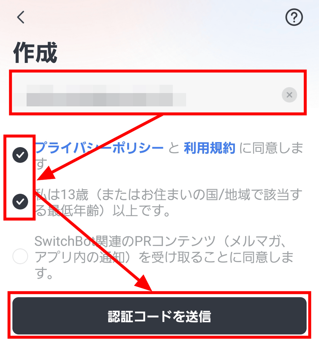 メールアドレスを入力し、「プライバシーポリシーと利用規約に同意します。」「私は13歳(またはお住まいの国/地域で該当する最低年齢)以上です。」の項目にチェックを入れたら、「認証コードを送信」をタップ。