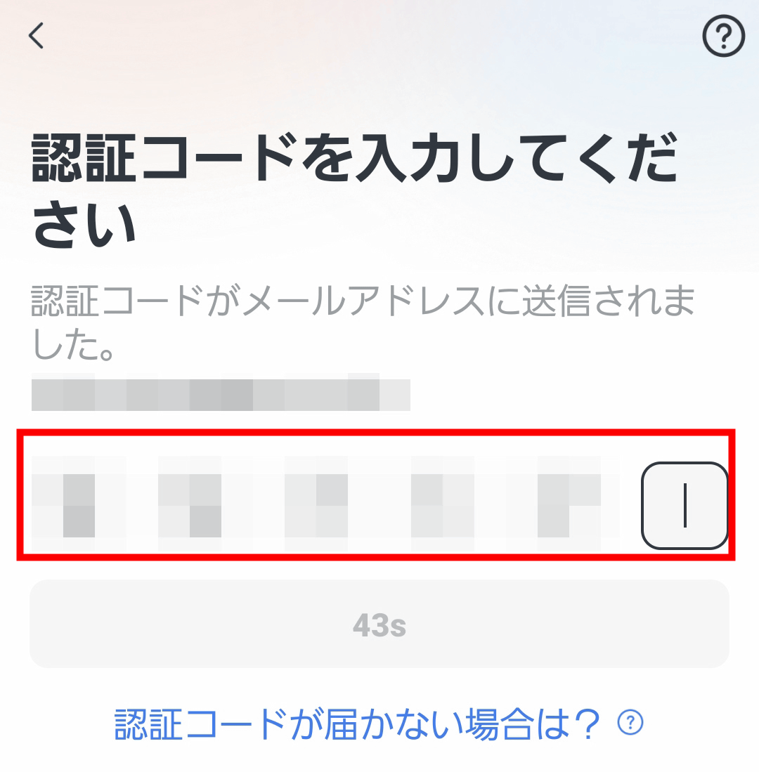 送られてきた認証コードを入力します。コードが合っていると自動で次のページに遷移します。