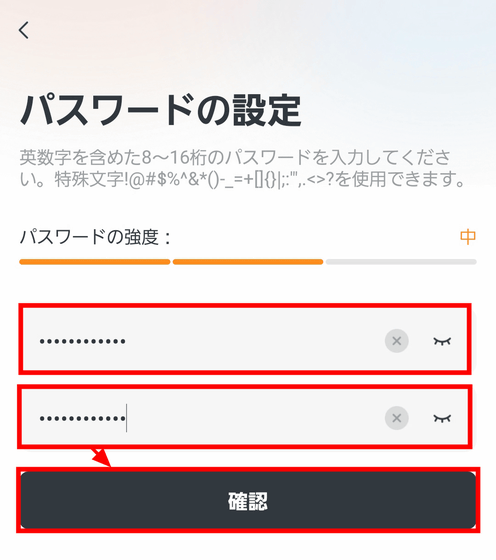 パスワードを設定するため、2回入力したら「確認」をタップ。