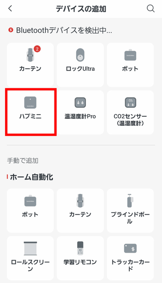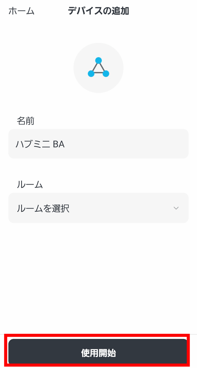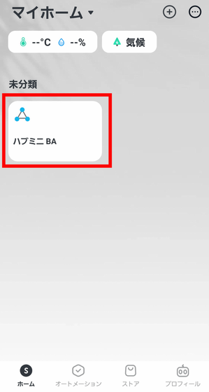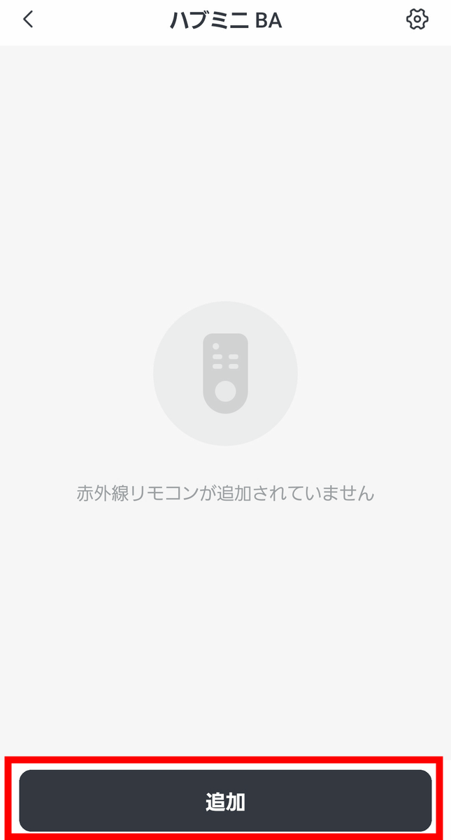 アプリのホーム画面にハブミニ 木目調が追加されました。追加されたハブミニ 木目調をタップして、スマートリモコンとしての設定を進めます。