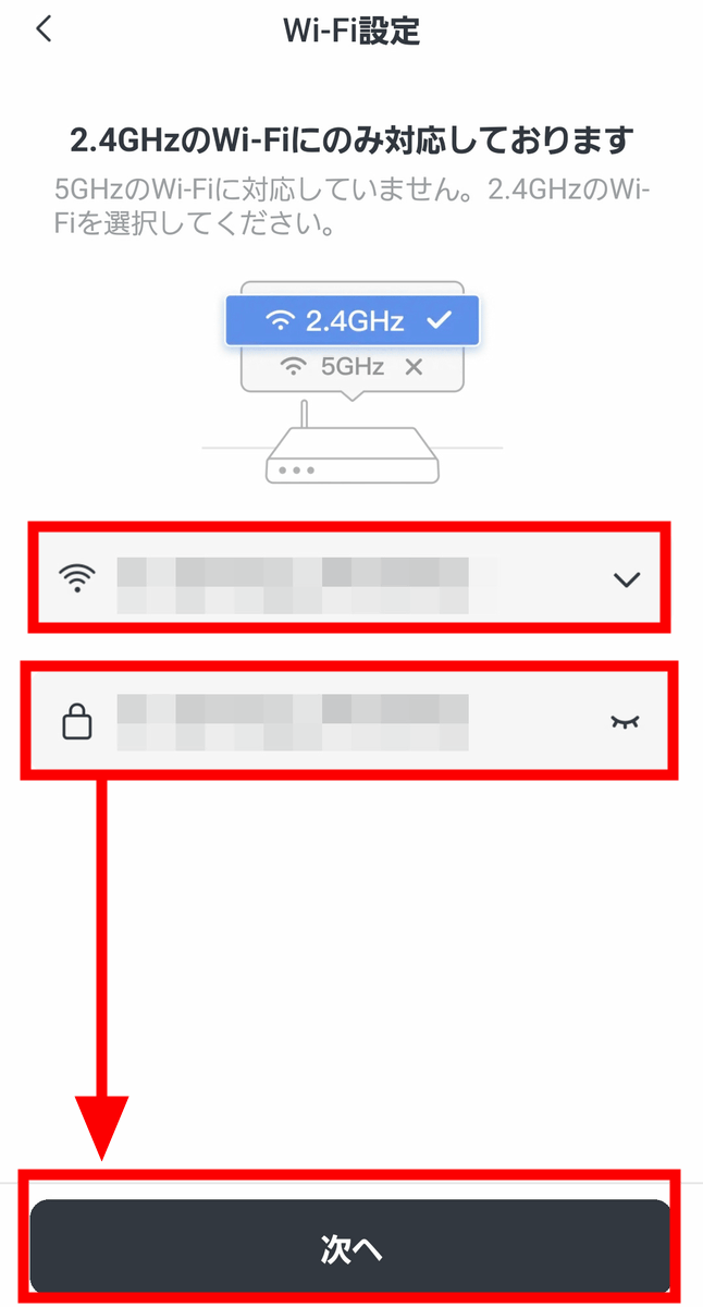 Wi-Fi設定に移ります。K11+を接続するWi-Fiを選択したらパスワードを入力し「次へ」をタップ。
