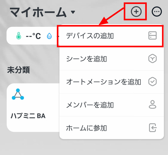 SwitchBotアプリの操作に移ります。ホーム画面上部の「+」アイコンをタップし、「デバイスの追加」を選択。