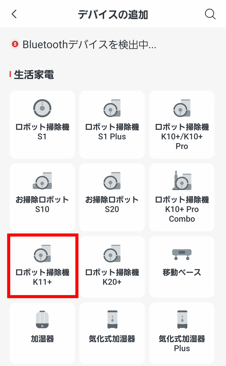 デバイスのリストから、「生活家電」の中に「ロボット掃除機 K11+」を発見したのでタップします。