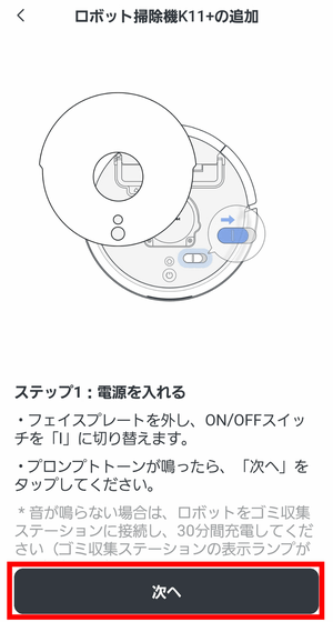 それでは実際にK11+を動かしてみます。ゴミ収集ベースをコンセントに接続。