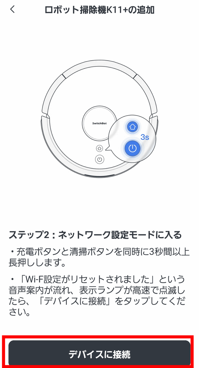 アプリの指示に従って、充電ボタンと清掃ボタンを同時に3秒間長押しします。