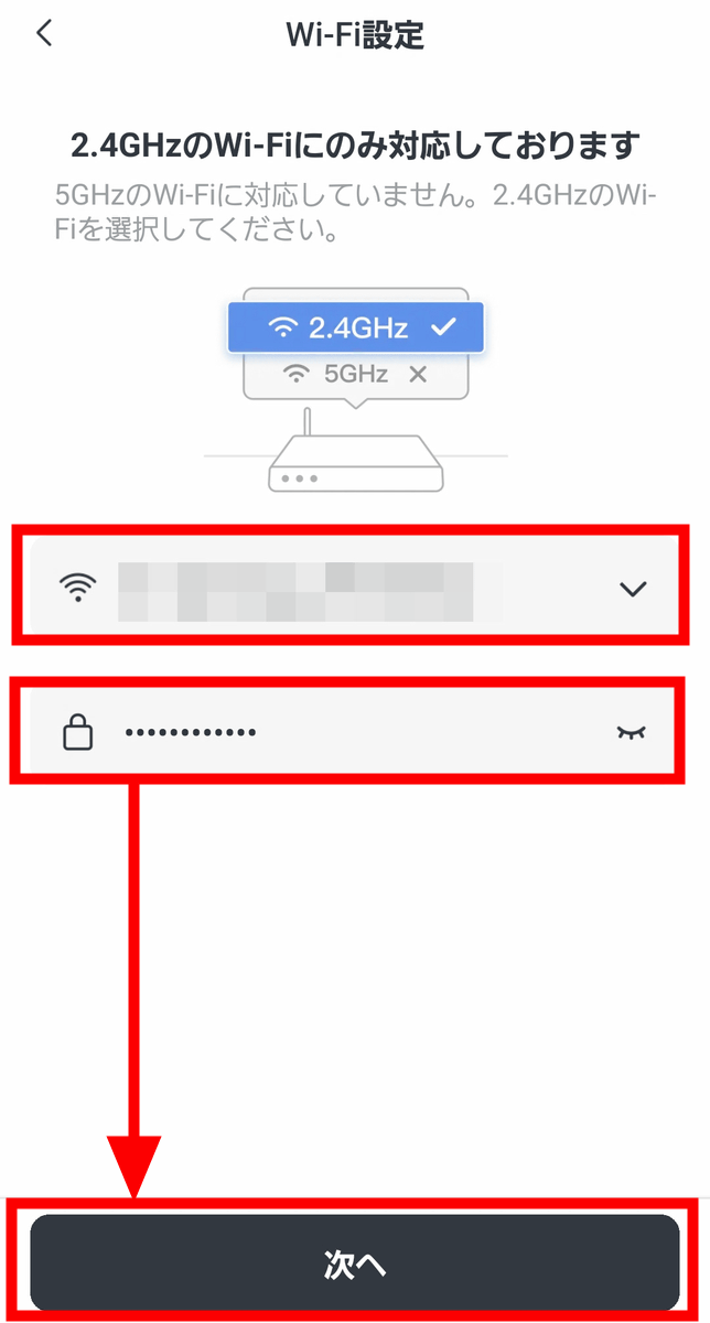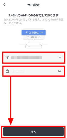 デバイスを認識したらWi-Fi設定の画面に移ります。SwitchBotフロアライトを接続するWi-Fiを選択してパスワードを入力後、「次へ」をタップ。