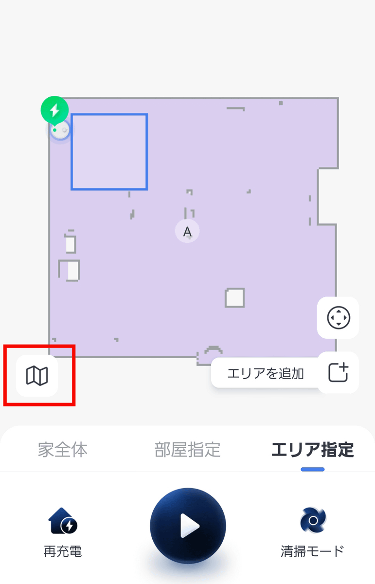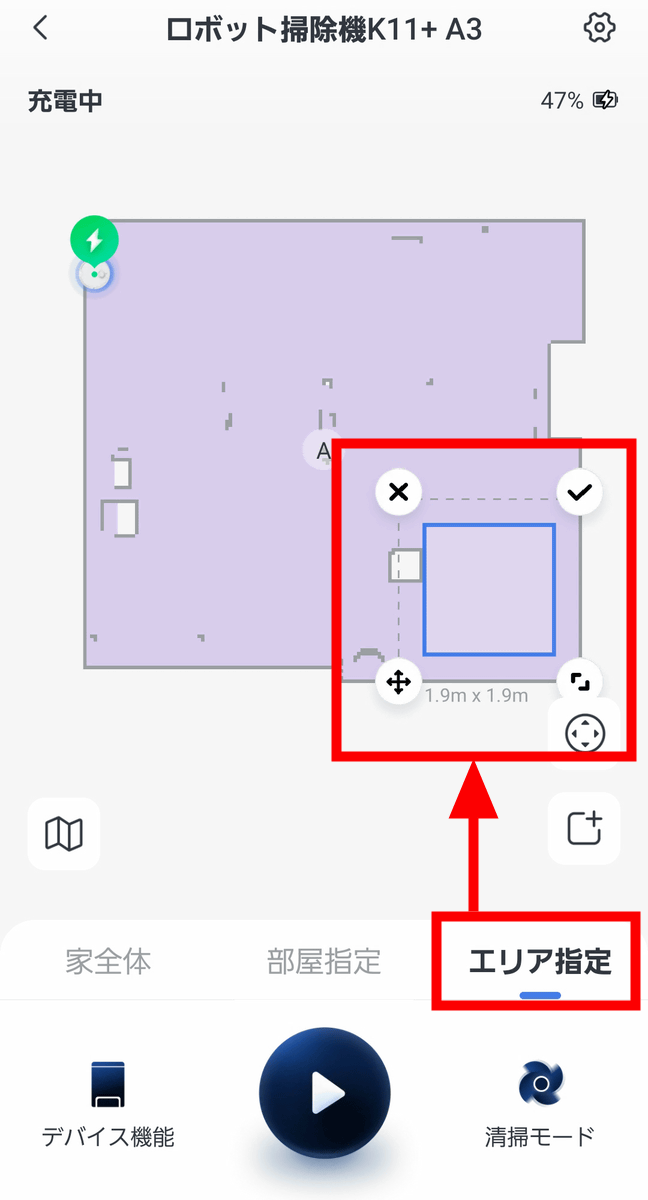 「エリア指定」からマップ上のエリアを選択することで、「部屋のここだけ掃除して」と指定することができます。