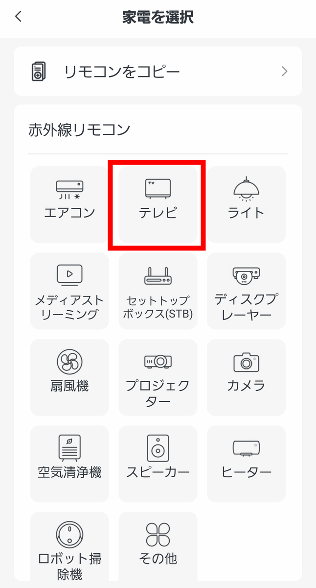 今回はテレビのリモコンをスマートフォンで代用できるようにハブミニ 木目調に登録します。「テレビ」を選択。
