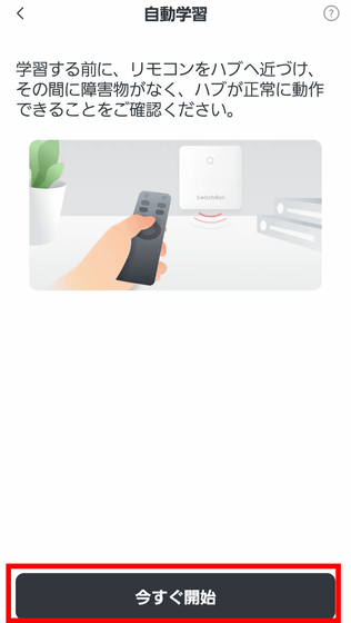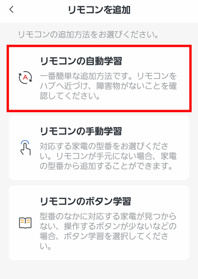 リモコンを登録する方法は、赤外線からリモコンの種類を認識させる自動学習、家電の型番を入力してリモコンを認識する手動学習、ボタンをひとつひとつ登録するボタン学習の3種類あります。今回は最も簡単に登録可能な「リモコンの自動学習」をタップ。