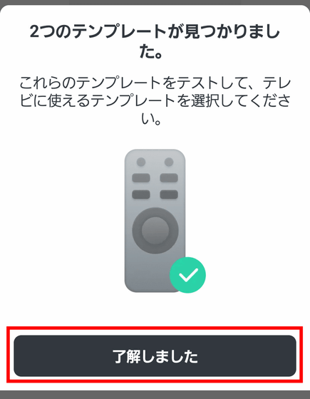 ハブミニ 木目調に赤外線が認識され、「2つのテンプレートが見つかりました」と表示されました。「了解しました」をタップして進めます。