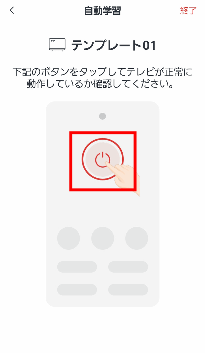 「テンプレート01」の電源をタップしたらテレビがついたため、「問題なく動いている」をタップ。