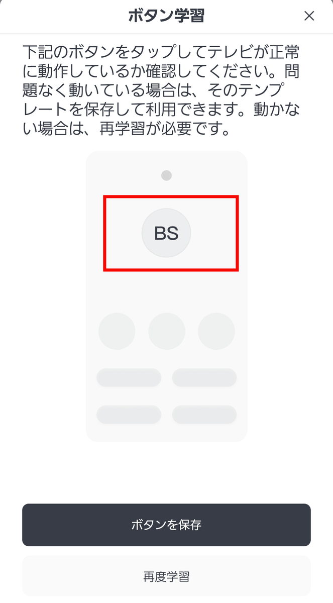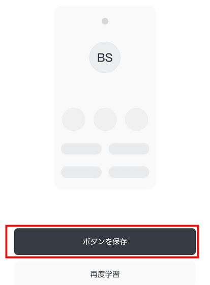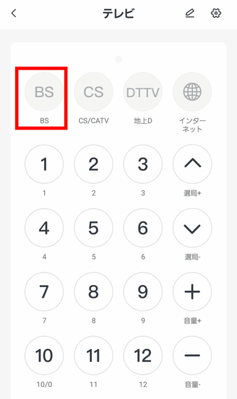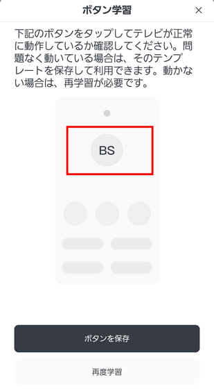 これでテレビのリモコンが、ハブミニ 木目調に追加されました。しかし、「BS」や「CS」のボタンはグレーアウトしていて使用できません。自動認識しなかったボタンについては、個別に設定すればOK。「BS」をタップ。