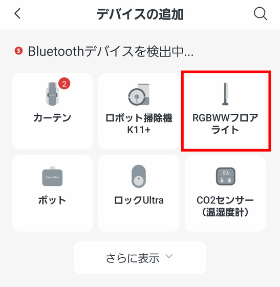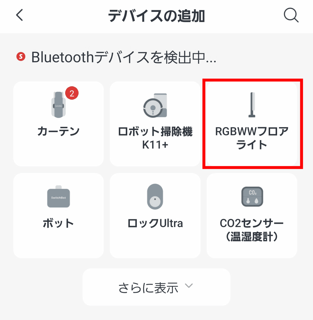 SwitchBotアプリからもSwitchBotフロアライトの操作が可能です。「デバイスの追加」から、「RGBWWフロアライト」を選択。