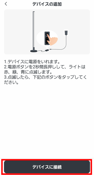 本体の準備が完了したらアプリで「デバイスに接続」をタップ。