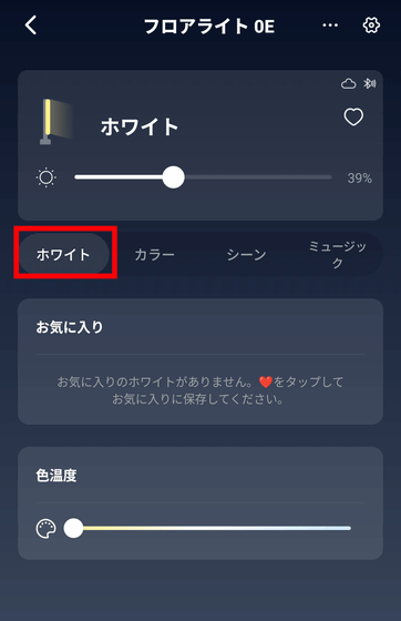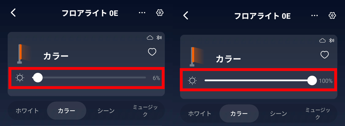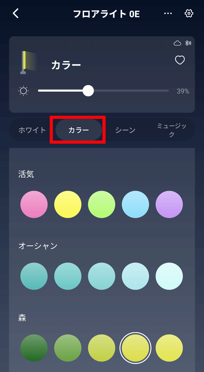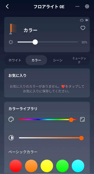 SwitchBotフロアライトのアプリ画面は以下のような感じ。