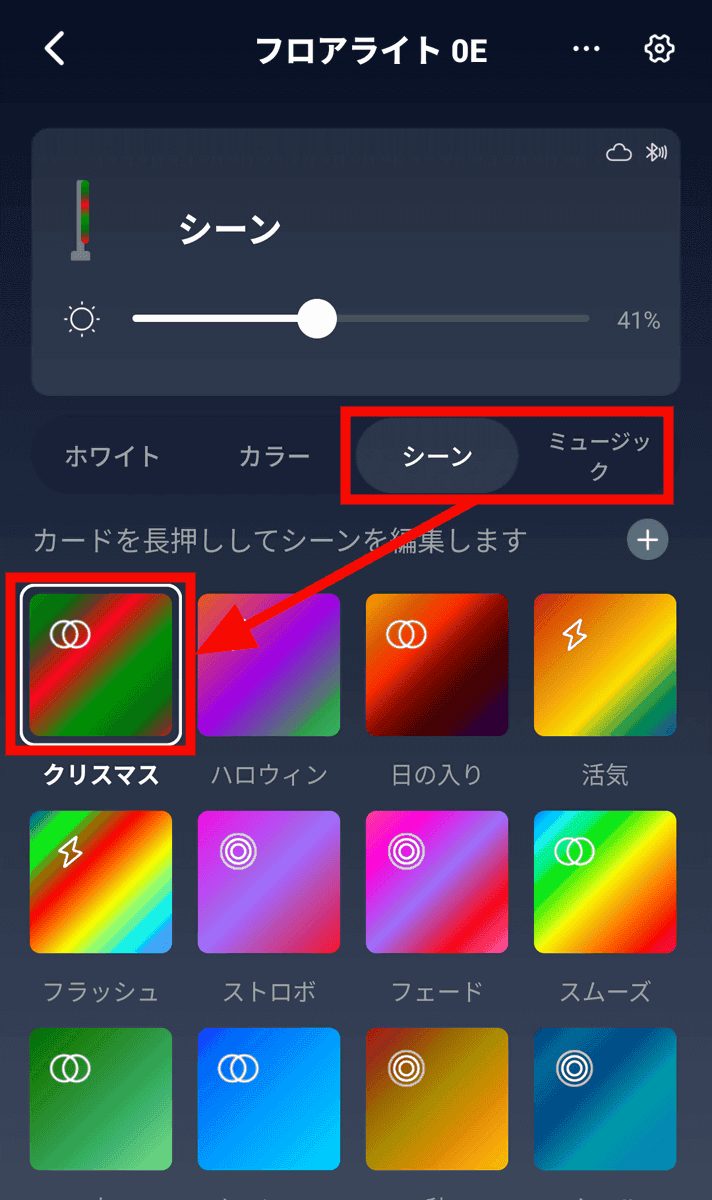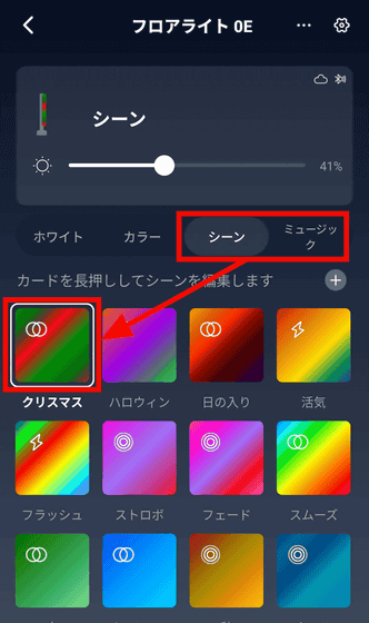 そのほか、「シーン」や「ミュージック」では、色が時間やリズムで自動的に切り替わるように設定が可能です。「クリスマス」を長押し。