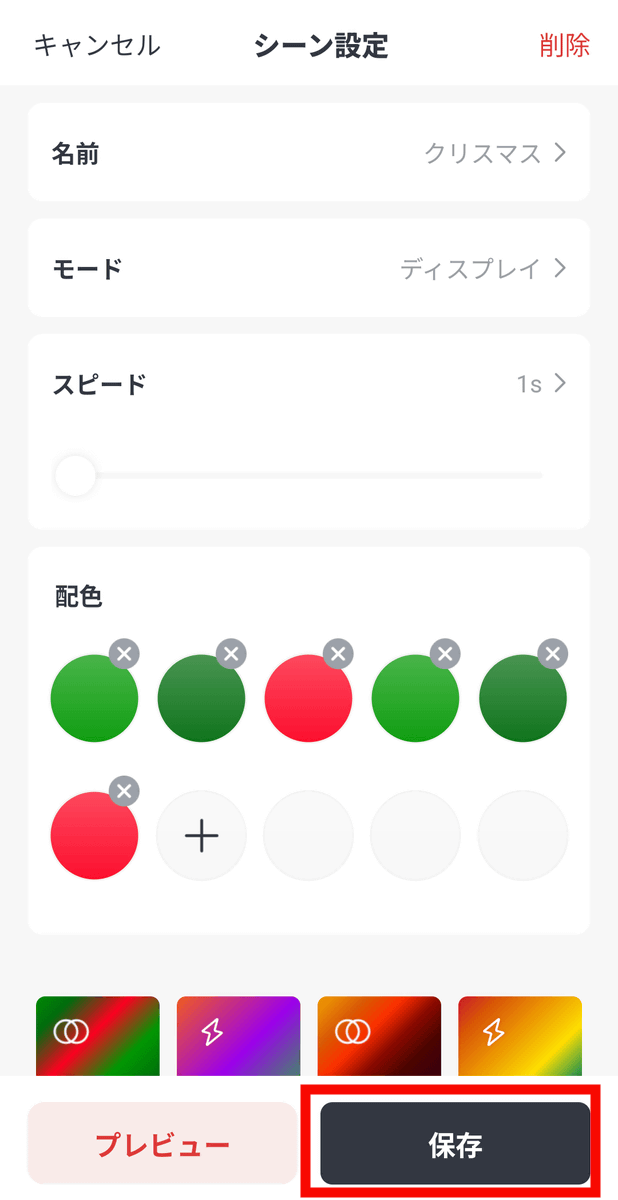色が切り替わるスピードや配色を設定することができます。設定後に「保存」をタップすると、次回以降も同じ設定でライトを点灯させることが可能です。