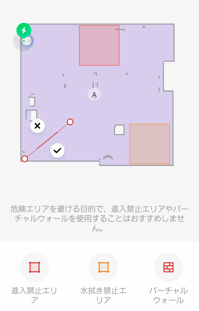 倒れやすい物が置いてある場所やカーペットなど、ロボット掃除機が通ると困る場所は「進入禁止エリア」に指定できるほか、水拭きだけを避ける「水拭き禁止エリア」も指定できます。「実際の部屋に壁はないけどここより先には進んでほしくない」という場所がある場合、「バーチャルウォール」をマップ上に描画することで、ロボット掃除機が自動で掃除する際に動く場所をコントロールすることができます。