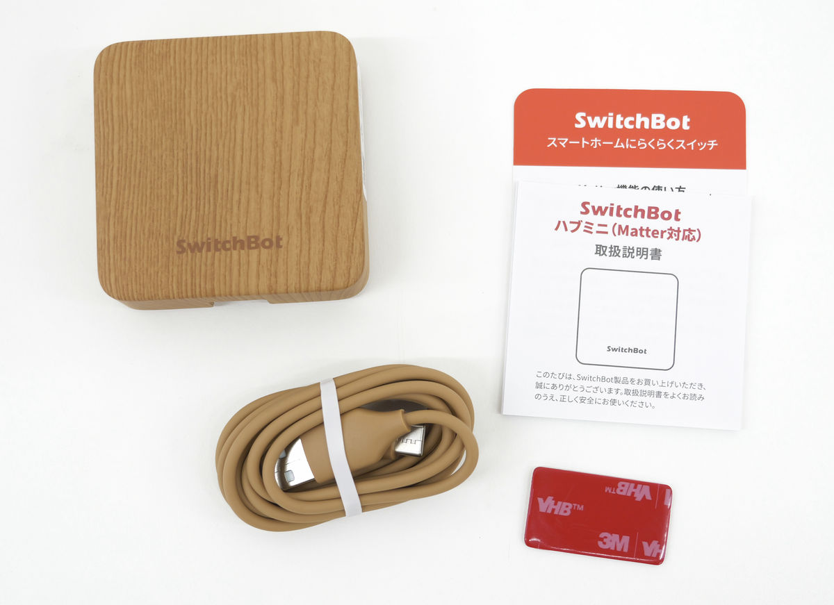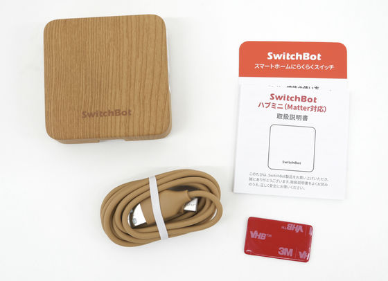 内容物はハブミニ 木目調本体、充電用のUSB-Cケーブル、取扱説明書、壁に貼り付ける用の両面テープ。
