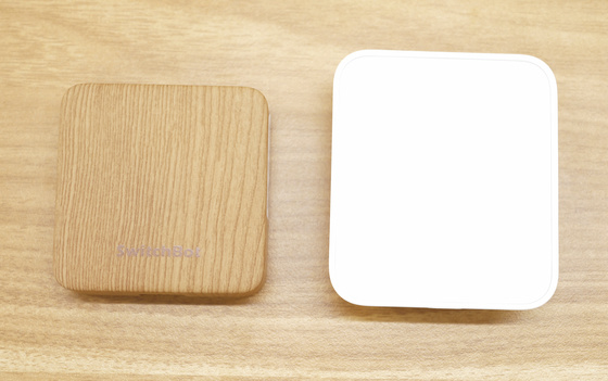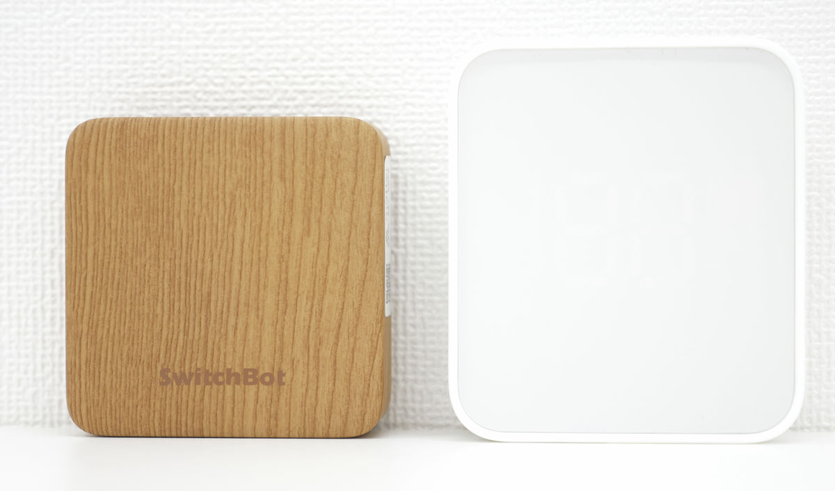 ハブミニ 木目調の機能は従来のSwitchBot ハブミニと同じですが、外観が木目調になったことで、「デバイスを設置しているいかにも感」を抑えて部屋の景観とマッチさせたい場合にオススメ。ハブミニ 木目調(左)とハブミニの後継機として登場したパネル付きの「SwitchBot ハブ2」(右)を並べて置くとこんな感じ。