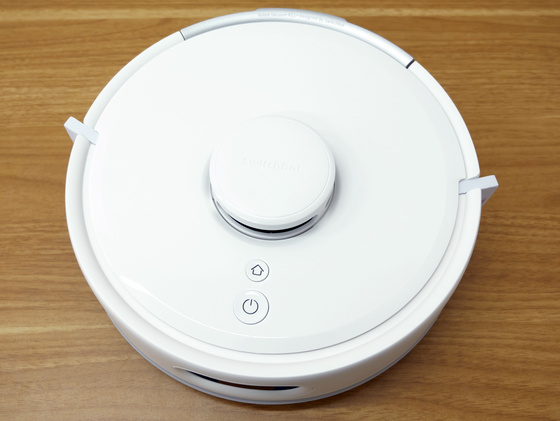 SwitchBot ロボット掃除機 K11+本体は以下のような感じ。本体サイズは248×248の円形で厚さは92mm、重量は約2.3kg。本体のサイズは前モデルのK10+およびK10+ Proと同じで、一般的なロボット掃除機と比べて一回りコンパクトなのが特徴です。本体天面には清掃ボタンと充電ボタン。