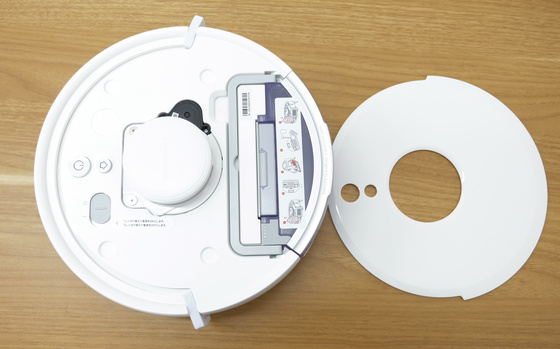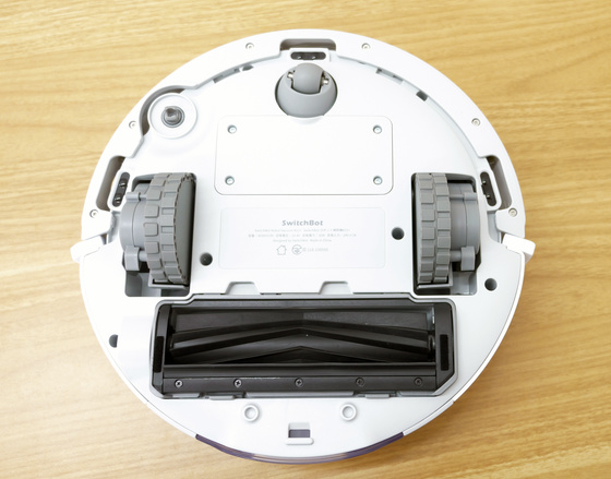 底面は以下のような感じ。両側の主輪には大きなでこぼこの溝があり、ある程度の段差なら軽々超えられるようになっています。また、本体前面の小さなタイヤは回転することでロボット掃除機の進行をコントロールしてくれます。