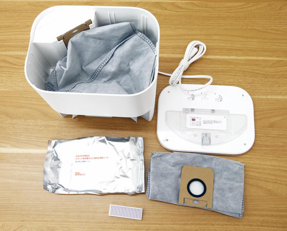 天面のフタを開けると、K11+に取り付けることで掃き掃除だけではなく拭き掃除もできる使い捨てシートと、取替用の紙パック、フィルターが入っていました。