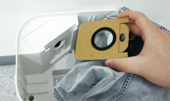 K11+で大きくアップデートされたのがゴミ収集ベースのデザインです。K10+およびK10+ Proのゴミ収集ベースのサイズは高さ323mm×幅261mm×奥行き210mmで、一般的なロボット掃除機のゴミ収集ベースに比べて高さも幅も20%ほどコンパクトでしたが、K11+はそこからさらに大幅に小さくなった高さ250mm×幅240mm×奥行き180mmの超コンパクトサイズです。高さは500mlペットボトルより小さいほどコンパクトですが、設置できる紙パックはゴミを4Lまで回収可能で、ゴミ捨ては年に4回でOKとのこと。