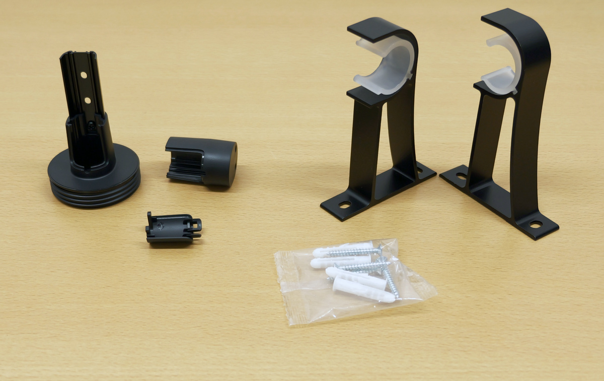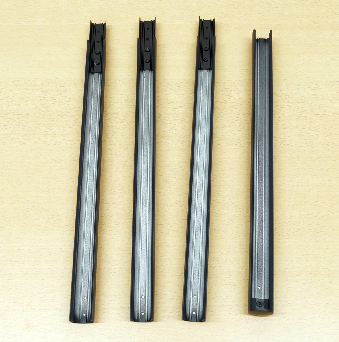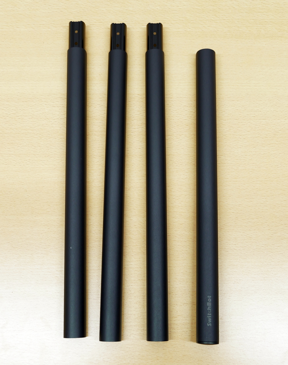 SwitchBotフロアライトの内容物を確認していきます。まずは支柱部分が4本。左の3本は同じもので、右端の支柱は一番上に設置するものです。
