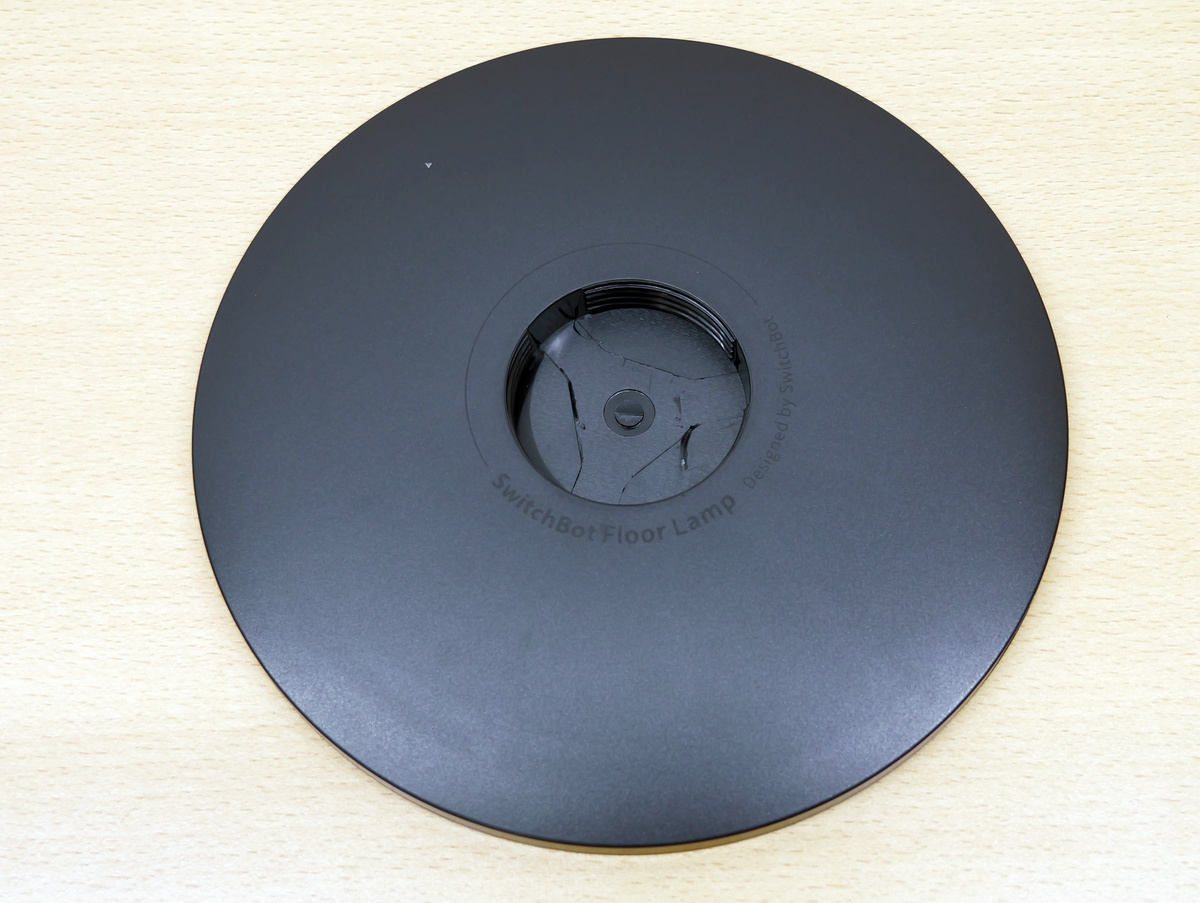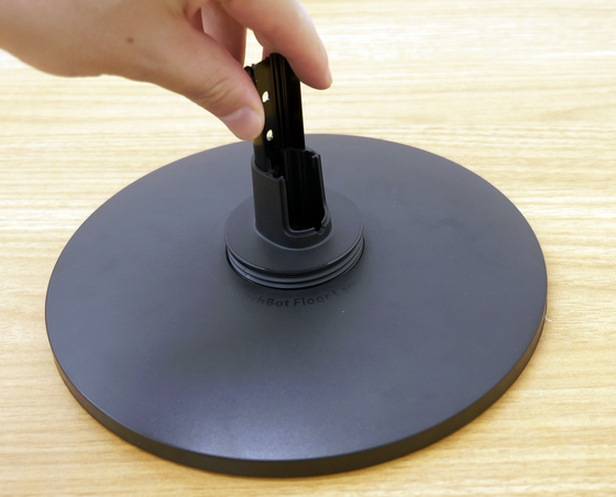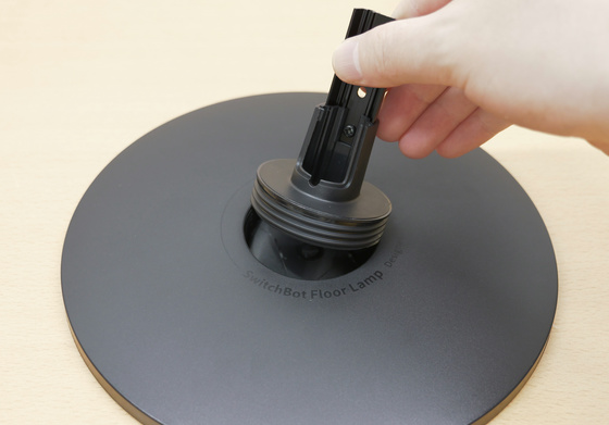 それではSwitchBotフロアライトを組み立てていきます。まずは縦置きのライトにするため、土台部分に縦置き用のスタンドをくるくる回してはめ込みます。