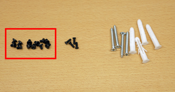 付属のネジは小さいものが12個、細長いものが4個、大きいものとカバーが4個ありますが、支柱をとめるのに使うのは小さいもの6個。