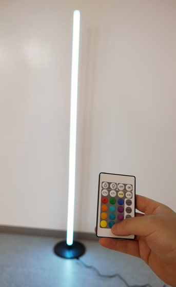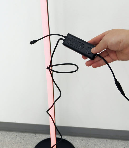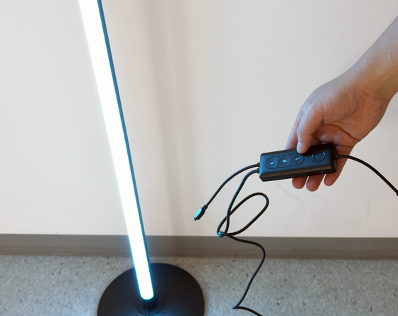 縦置き用のスタンドに再設置した後、SwitchBotフロアライトのさまざまな便利な機能を試してみました。電源の操作や簡単なモード切替は、本体に接続されたコントローラーでも可能。