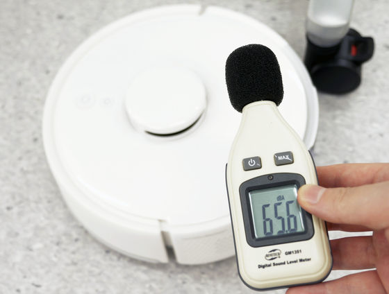 動作中のK11+に騒音計を近づけたら65.6dbと、走行中の車内やデパート内の音など「人がうるさいと感じ始めるレベル」の音量。ただ、2mほど程度離れて計測すると45db~55dbほどだったため、掃除中に近づきすぎなければあまり気にならない程度の騒音です。